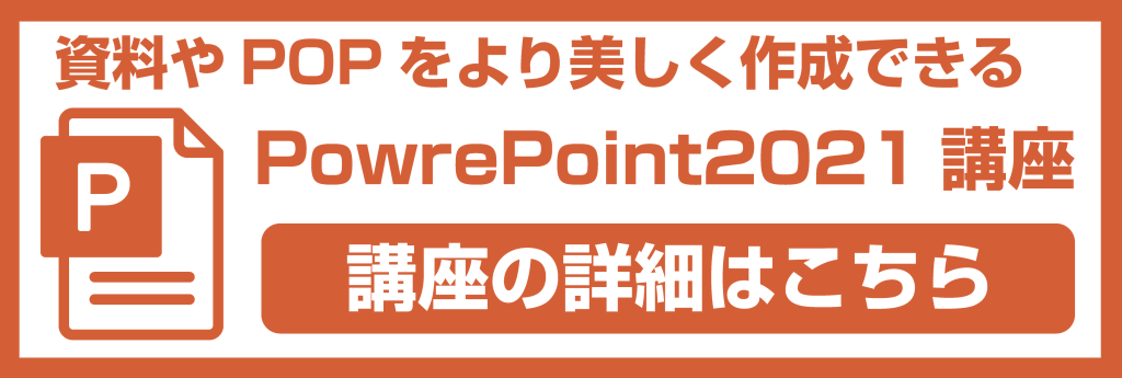 | アニメーションや動画を組み込んだ プレゼン資料を作りたい | Power Point講座 難易度:中級 | パワーポイントの一般的な機能を学ぶことができ、ワードでは作れなかった見栄えのいいPOPなども作れるようになります。またプレゼンや説明資料などもパワーポイント特有の機能を使ってよりわかりやすくデザイン性の高い資料が作成できます。 |